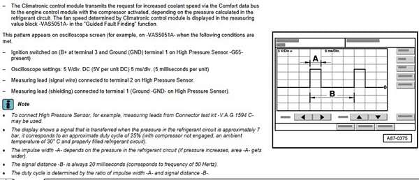 – Audi A8 D3 AC system: As I understand while having this experience, the AC system blows cold or hot air whenever it feels like last few months and it’s totally out, the ECON settings was forced to ON = AC OFF. G65 High Pressure Sensor 8E0959126 (old part#) 3R0959126 (new part #) sensed the pressure and tells the N280 pressure regulator NOT to turn on. According to ElsaWin, if the waveform on the G65 is over 87% duty cycle, the Freon pressure is too low and under 12% duty cycle, the Freon pressure is too high. G65 is just a Pressure PWM (pulse width modulator) sensor, so after market ones should do $39 vs $89-105 from dealer.