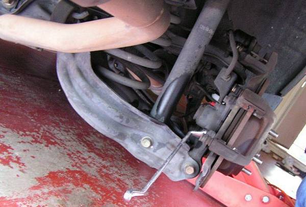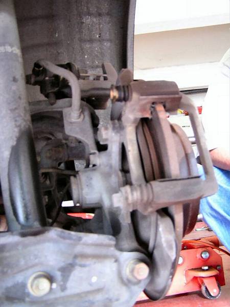 We need to remove the brakes pads, there are two bolts (either 10mm or 12mm we don’t remember, Honda likes even number) in the back of the rear caliper, use an extension to loosen them.