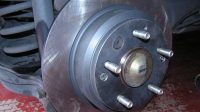 remove the rotor, and don’t forget to knock out the black round rubber cover to put on the new rotor, on the left of the picture. Release the hand brake (if it’s engaged) so we can remove the rotor.