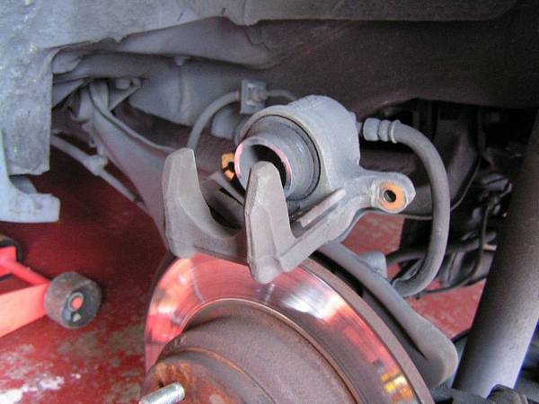 Normally, if we just want to replace the pads, loosen the top bolt, then remove the bottom bolt, lift the caliper up, then we can get the old pads out to replace with the new pads, very easy.