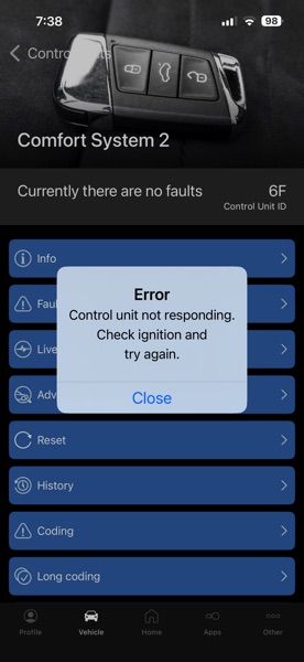 Today I went out to the car and turn on the ignition and nothing, no steering wheel unlock and nothing on the dash board. The battery is 12.7V, all lights and radio work. After reading on the internet, the steering lock actuator is sleeping and doesn’t turn on. We need to wake it up by using Obdeleven to clear the code for it to wake up. The reason for this to happen because of the ESP light keep coming on because of the MAF I replaced a few months ago failed again. Here is the trick to be able to scan the failures and clear the code. The code is 00288 – Steering Column Lock Actuator.