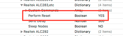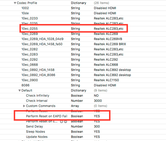 Now if everything works with the sound then your codecs work with this EAPD codec-commander. If the kext is installed and it failed like described above, then you need to modify the info.plist in the kext itself. Change Perform Reset on EAPD Fail to TRUE.