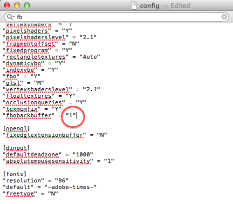 The Mavericks OS 10.9.4 on Sandy Bridge HD3000 with resolution 1600×900 failed to load Spore game – the screen stuck at black with a cursor only. It doesn’t happen with Ivy Bridge HD4000. The way to fix this is to change the “fbobackbuffer” from “0” to “1” in the config file. To access the config file, we need to un-hide the “library” from the user – the software is Minecraft mac helper.