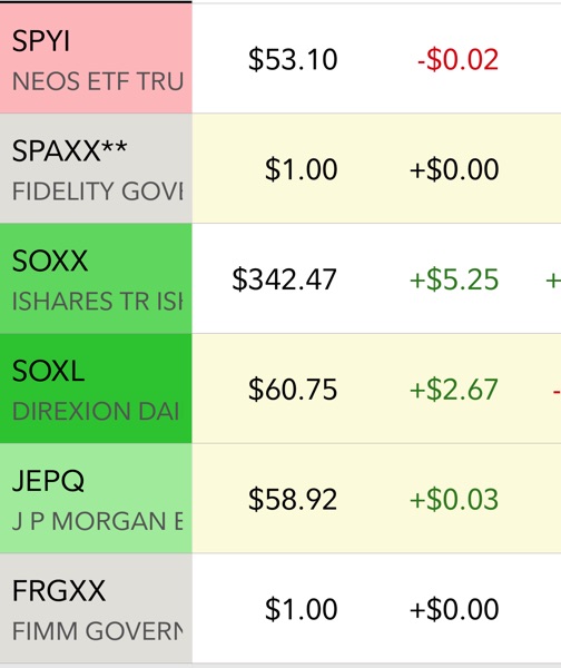 I only invest in Semiconductor ETF, SOXX and SOXL, SPAXX, FRGXX, SPYI, JEPQ since I’m home and monitor the stock market daily.
