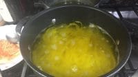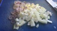 Ingredients includes: pork belly, shrimps (small to medium), mi quang powder, fish sauce, back ribs for soup, salt, MSG, sugar, onions, shallots, green onions, garlic, broken roasted peanuts, sesame rice cake.