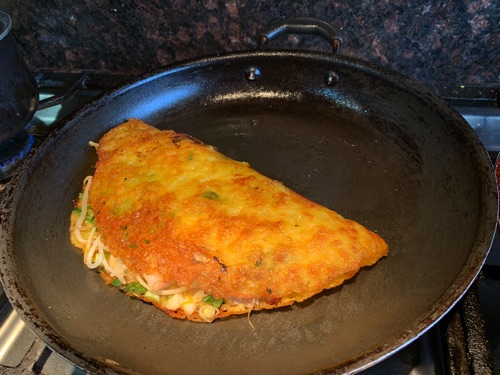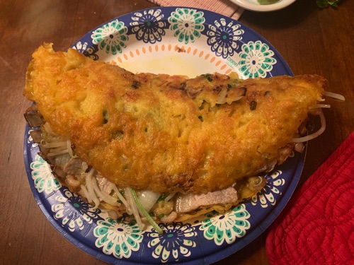 Nhà mình thích ăn giá, bỏ nhiều vào trước khi đậy nắp chảo cho chín bột mặt trên, để một phút, lắc cái chảo coi cái bánh có bị dính vào chảo không. Chiên cháy một chút cho thơm và dòn tan. Mình dùng cái môi lớn là vừa cho một cái bánh. Ăn hai cái có đầy đủ thịt, tôm là no cành hông. Tôm hôm nào sale ở chợ Mỹ 31/41 là mình lượm để làm bánh xèo, không to quá nhưng không nhỏ như tép. Làm ở nhà ngon rồi, không thể đi ăn tiệm được, không thời giờ đâu mà vừa ăn vừa nhần vỏ, mình chấp nhận là mình không biết ăn tôm kiểu VN, quê cũng được LOL.