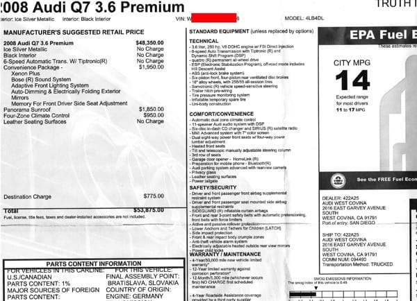 - Mình lấy thí dụ năm 2008, xe không bán được vì recession, Audi cho mình một cái lease rất rẻ, coi như không có tiền lời luôn. MSRP là $53,875, sau 3 năm lease với 10k miles một năm residual là 53% = $28553 (nghĩa là sau 3 năm minh trả $28553 + thuế là mua luôn xe). Nó bán cho mình là giá $49399, mình down $4,500 thì cái depreciation hàng tháng là ($50624-4243-28553)/36 = $495.16/tháng, tiền lời cho cả 3 năm chỉ có $161/36 = $5/tháng (gần như free), cả thuế mình trả $543.4/tháng cho 35 tháng còn lại. Khi mình lease mà bỏ tiền down nhiều thì phải trả thuế trên tiền down, nên lease mà $0 down thì tốt hơn nhưng tiền tháng sẽ lên cao hơn.