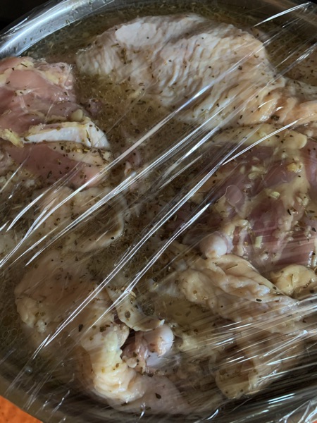 Pha mọi thứ cho đều và nếm cho vừa ngon miệng, chua chua, mặn mặn. Ngâm những đùi gà vào rồi đậy lại với saran wrap bỏ vào tủ lạnh một ngày.