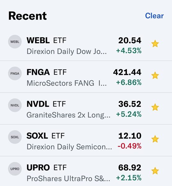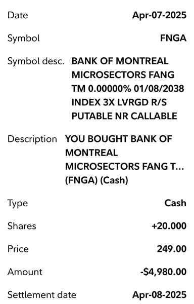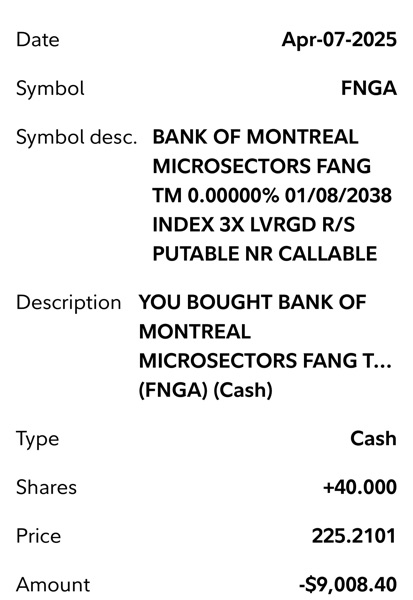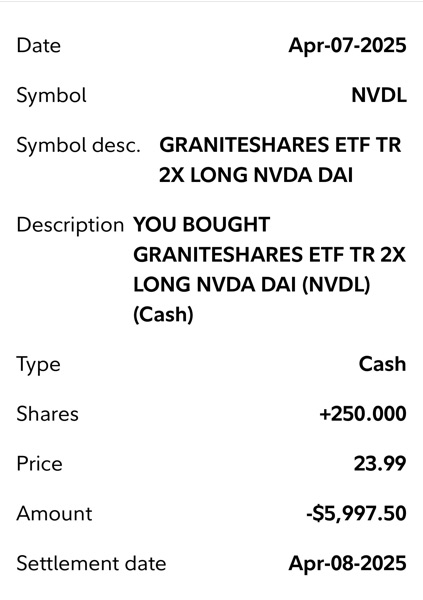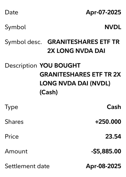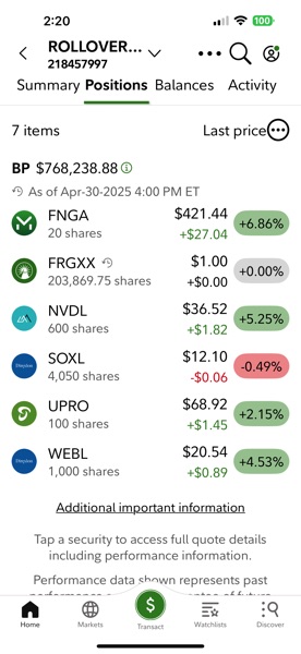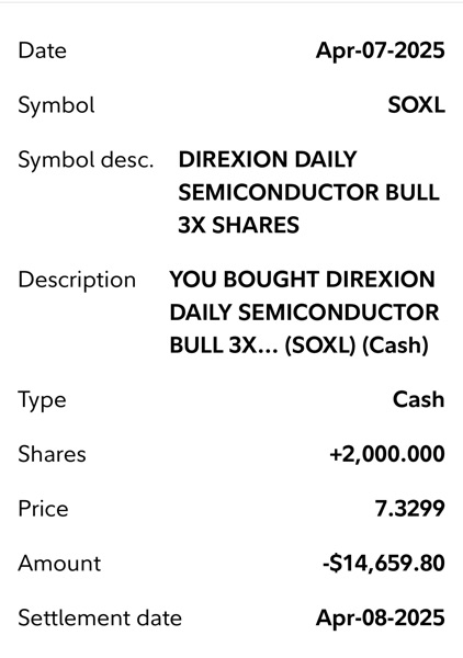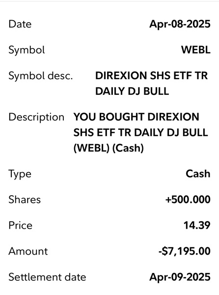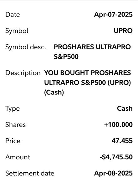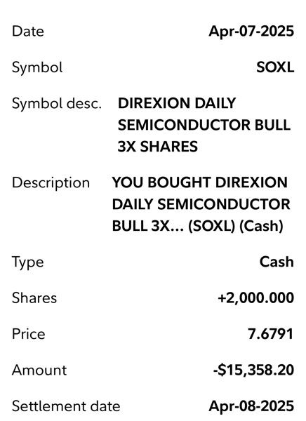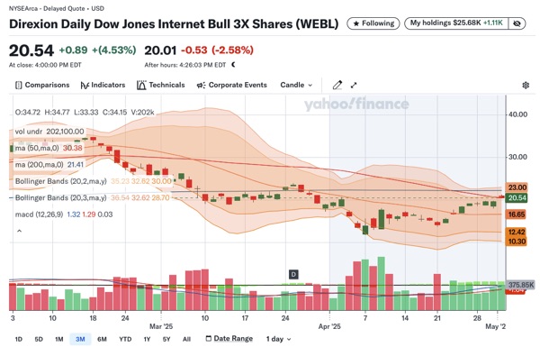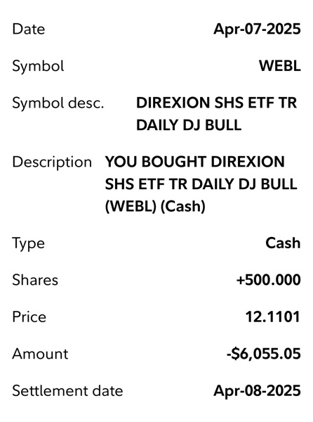 Thí dụ khi FNGA mua được $225-$249 (4/7/2025) mà bán được ở $428 (5/1/2025) thì đã lời 90% cho shares này rồi. SOXL mua được $7.32-$7.7 (4/7/2025) mà bán $12.25-$12.4 (5/1/2025) là lời 66%, WEBL $12.11-$14.3 bán $21 là 61%, NVDL 23.9 và bán ở $35 là 45%, UPRO $47.45 bán $65 là 38%.
