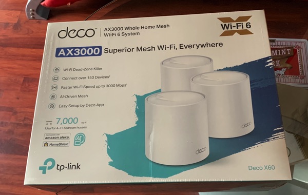 It’s time to have Mesh WiFi 6 system installed for our Sail Internet. Costco has TP-Link Deco x60 AX3000 Mesh WiFi 6 on sale for $199. We’ve been using Orbi RBK50 with 1 satellite which was quite good. We’ve just installed this yesterday, the performance on the Wifi is excellent, I could get signal out in the back yard with 90Mbps which Orbi couldn’t do. The only thing about this router is that we have to have TP-Link account to configure the Router. Orbi has 4 Gb Ethernet ports while these only have 2 each.