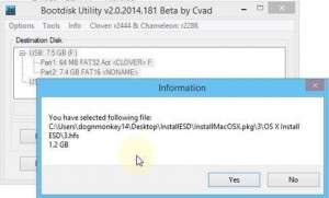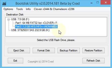 1. Use BootDiskUtility to create 2x 1.2GB USBs OS X BASE Systems – Use Transmac to copy mach_kernel to make it boot and installable without “Packages”. Use Multi Patitioning option and change the size of the boot partition to your liking, 64MB default is plenty for Chameleon, but you can change to 128-356MB if the Extra folder is big. There will be 2 partitions created, boot and the rest (depend on your USB size).