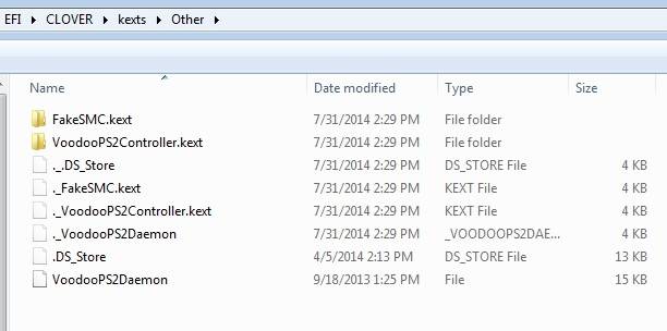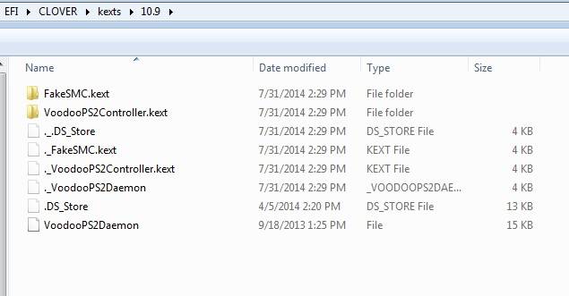 4. kexts folder: I put 2 important files: FakeSMC.kext and VoodooPS2Controller.kext in both “10.9” and “Other”. Since there are no Wifi – Ethernet – Battery Management – etc in these folders, make sure you install all your kexts in the Mavericks USB External hard drive.