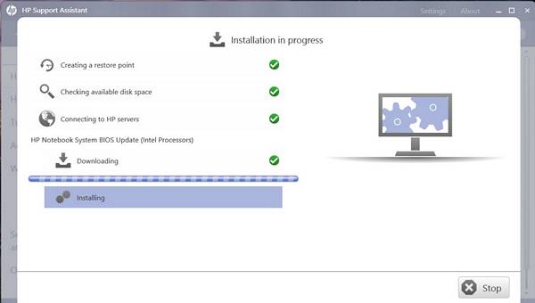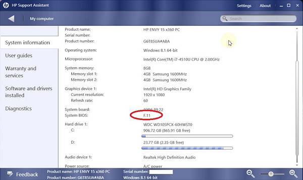 The BIOS that came with the laptop was F.7 and the new one was F.11, I used the HP Utility Center to update the BIOS. Make sure the AC charger is plugged in, internet is connected, the best is to use wired (RJ45 ) to the router, but all we need is to download the correct file for the update. When the download is done, after the reboot, it will automatically go to the flash bios screen and it will start automatically.