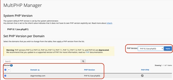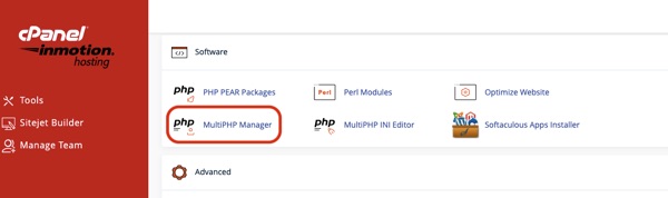 To upgrade php with Inmotion Hosting, go to Cpanel and click on MultiPHPManager – Select the domain and php version then click apply. If everything is good, the blog will load nicely.